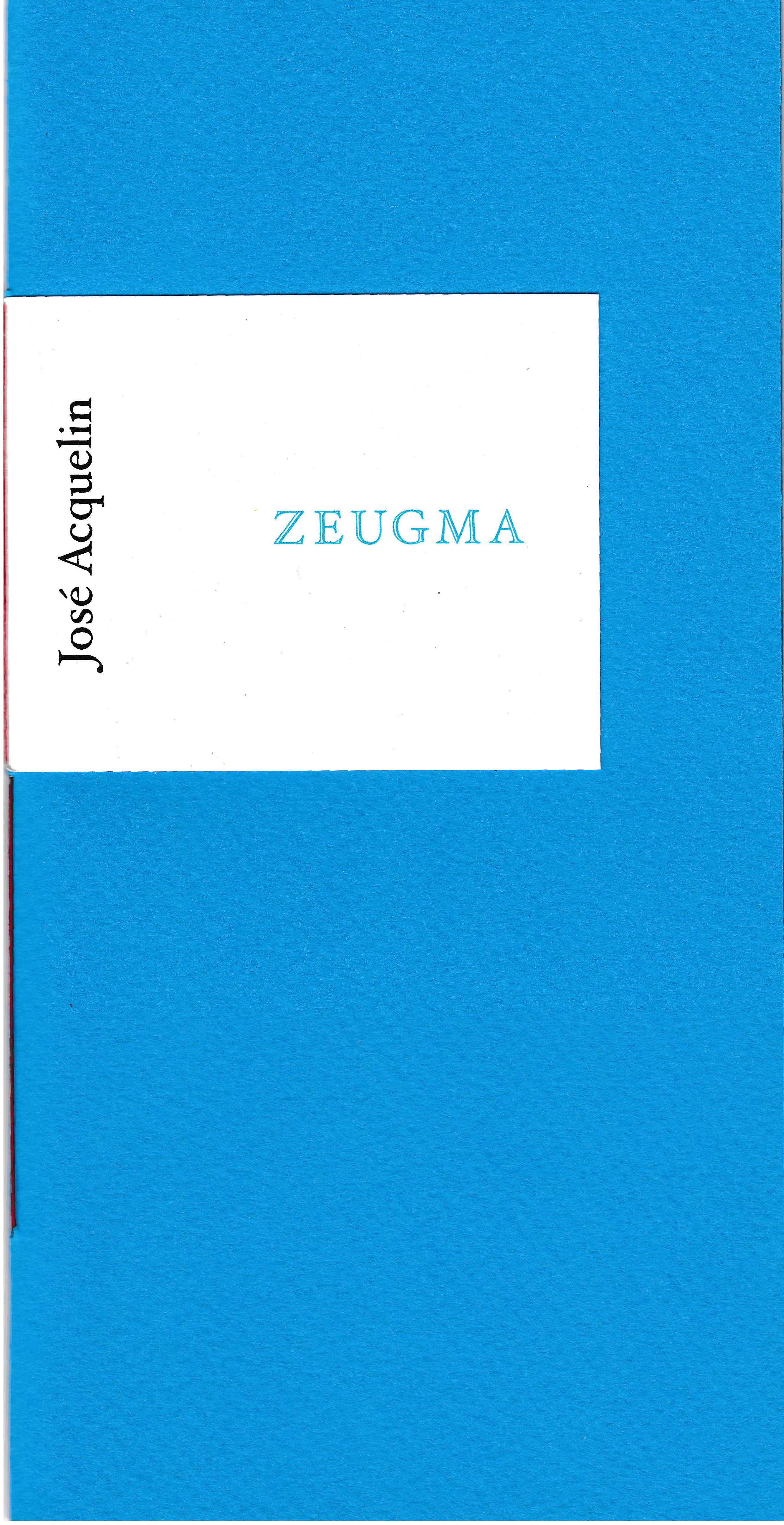 Zeugma de José Acquelin, avec une illustration de Louise Latraverse, Les loisirs de la poste, numéro un, Montréal, juin 2020, 28p. Tiré à 80 exemplaires.